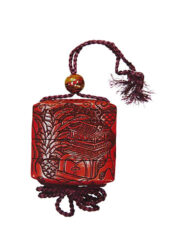 この作品は明治時代の 骨董品 の印籠で、鎌倉彫の三段の印籠です。材質は木製で小さな骨董品の印籠ですが、鎌倉彫りで丁寧に描かれた明治時代の骨董品で、古い時代 の図柄です。さすが昔の 職人技 だと思わせる 図柄 で、小品ですが現代の作家には見られない骨董品で、丁寧に作られた印籠です。内側は梨地が施され、しっかりした作りの骨董品の印籠です。この印籠以外にも骨董品の 古美術工芸品 は現代の著名な作家でも難しい蒔絵や細工が見られます。骨董品の印籠ですが、紐は近年に新しい紐と取り換えられております。