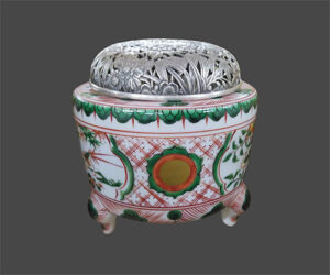 この香炉は三浦竹泉の赤絵の香炉です。赤絵で素晴らしい出来の、銀火屋が付いた綺麗な香炉で買取ました。三浦竹泉の作品で、赤絵も丁寧に描かれており、昔の職人技が素晴らしい骨董品の香炉で買取させて頂きました。三浦竹泉は代々続いた陶芸家で、この作品も伝承された昔の職人技が冴える優雅な香炉です。火屋は純銀で、非常に細工の良い彫金細工が施されております。この香炉は未使用品で、共箱も非常に綺麗で大切に保管されていた逸品です。この作品は骨董品で共箱で二重箱です。