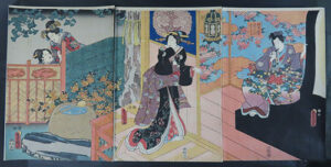 この 骨董品 の浮世絵版画は美人画の部類の骨董品の浮世絵版画で買取ました。三枚続きの 美人画 の浮世絵版画でご覧のように骨董品ですが 保存状態 の良い浮世絵 版画 で買取しました。このような骨董品の美人画の浮世絵版画も人気がありますが、大首絵と言う浮世絵版画は主に江戸時代の骨董品で描かれていた浮世絵の様式のひとつで、骨董品で美人画の歌舞伎役者や遊女、評判娘などを半身像や胸像として捉えて描いた美人画の浮世絵版画の事を言いこのような骨董品の美人画の浮世絵版画が人気があります。