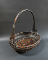 日本の竹籠や竹工芸には、囲炉裏端で使う煤竹が使われております。近年ではその材料を手に入れることが困難になりましたので、やはり昔の煤竹がふんだんに使われた竹籠で、かつ編み組細工が素晴らしい逸品や荒々しい作風の作品が高価買取対象となります。関西の作家では、田辺竹雲斎、前田竹房斎、早川尚古斎、和田和一斎が人気で、関東の作家では、飯塚 琅玕斎、飯塚小玕斎、飯塚鳳斎、鈴木玩々斎などが高価買取対象です。代々の作家の中でも特に、初代の作家の作品が高価買取対象です。また、薄茶色の竹で編まれた竹籠より、濃い茶褐色の煤竹で編まれた竹籠の方が高価に買取させて頂けます。