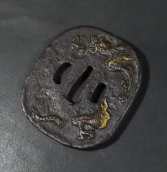 時代は江戸時代頃の鍔で材質は鉄です。鉄は硬くて細工が難しいのですが、伝承 された彫金細工や 象嵌細工 が 冴える昔ながらの骨董品で 刀装具 の 鍔 で買取ました。長年の時代を経てきた骨董品で、鉄地に象嵌細工や 彫金細工 が施され、鉄味 が素晴らしく、力強い風格が見られる刀装具の鐔で買取ました。両面に施された龍の象嵌細工は、昔作られた 骨董品 で今では見られない江戸時代の味わいのある 職人技 が冴える 逸品 です。