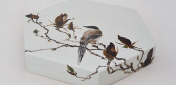 作品は、草白釉釉描 色絵 銀彩鵙枯葉図四角隅切大筥、色絵木蓮と鵯八角筥、草白釉釉描色絵金彩翡翠図六角筥、等々。