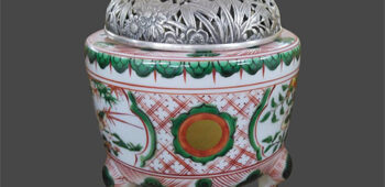 この香炉は三浦竹泉の赤絵の香炉です。赤絵で素晴らしい出来の、銀火屋が付いた綺麗な香炉で買取ました。三浦竹泉の作品で、赤絵も丁寧に描かれており、昔の職人技が素晴らしい骨董品の香炉で買取させて頂きました。三浦竹泉は代々続いた陶芸家で、この作品も伝承された昔の職人技が冴える優雅な香炉です。火屋は純銀で、非常に細工の良い彫金細工が施されております。この香炉は未使用品で、共箱も非常に綺麗で大切に保管されていた逸品です。この作品は骨董品で共箱で二重箱です。