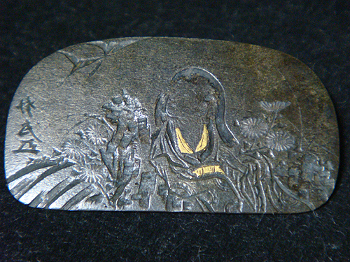 この飾金具の材質は四分一です。時代は江戸時代から明治時代にかけてのものだと思われます。ご覧のように 片切彫 で丁寧に 彫刻 され、象嵌細工も施されており、出来の良い 逸品 です。分厚い金具で作られており、重量感 があります。在銘 ですが、作者についてはよくわかりません。採光の加減で白く光っておりますが、保存状態 の良い品物です。