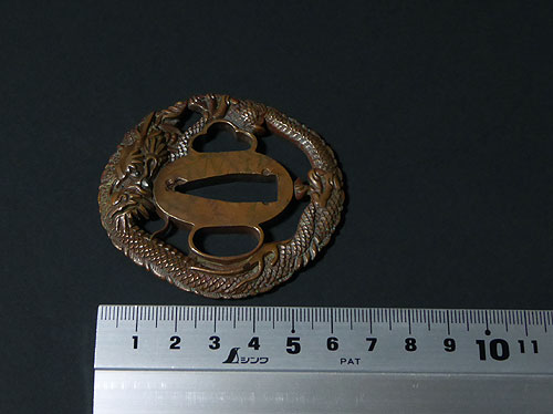 この 刀装具 の鍔の材質は銅で、時代は江戸時代のものだと思われます。古い時代の、丁寧で味わいのある 職人技 が冴える逸品です。長年使われてきた痕がありますが、ご覧のように、状態の良い品物です。このような小さな作品でも、日本独自 の 彫金細工 や象嵌細工が施された、昔の職人技が素晴らしい作品などは 愛好家 の方々に人気があり、入荷をお待ちのお客様も多くおられます。