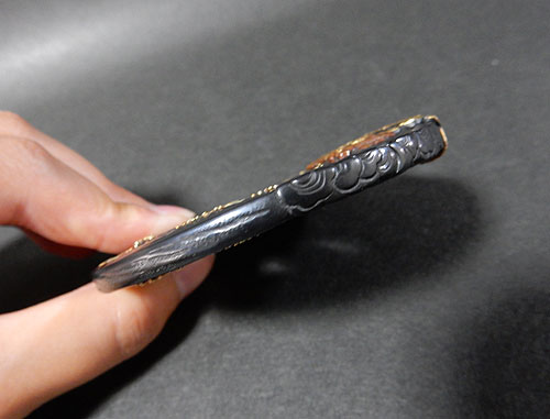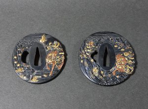 この鍔は材質は 赤銅 で、江戸時代に作られた逸品です。作者は、浜野良昆(小栗良直の門人、江戸時代後期に活躍した金工作家)の作品です。大小二つあるので、大きい方から写真を掲載しています。この鍔は現代の職人ではなかなか作れない、二枚一組で 在銘 で丁寧な彫金細工と象嵌細工が施された、江戸時代後期の職人技が冴える逸品です。山口県周南市の先々代がコレクターの方より、直接買い付けた品物で、この地は文化人や政治家が多く出ておられ、文化レベルも高く、面白い古美術工芸品をお譲り頂くことが有ります。
