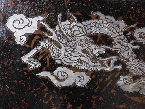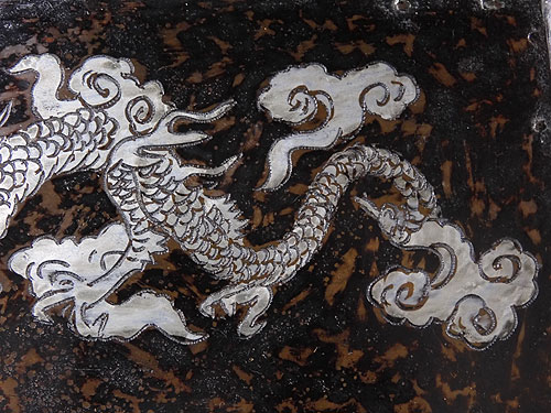 このような細かい彫りに金箔が埋められた作品を布目象嵌と言います。今回の作品とは違いますが、ついでで悪いですが布目象嵌の説明を少しさせて頂きます。布目象嵌とは、鉄地 の表面に多方向から細い切れ目を入れ、その出来た谷部に金銀等を打ち込む象嵌 技法 を特に「布目象嵌」といいます。その地元で作られて繁栄したことから「京象嵌」とも呼ばれるポルトガルや諸外国からの品物にそのような装飾がなされていたことから、鉄地への金銀装飾が武器・武具へ広く応用され流行しました。江戸時代には埋忠、正阿弥など武具職人が優れた 象嵌細工 を制作しています。廃刀令 を転機に新たに美術装飾品や装飾小物を手掛けるようになり、1878年のパリ万国博覧会へ正式出展したのを機に、ジャポニズムに沸くヨーロッパで高く評価されました。明治時代の駒井音二郎の作品は、Komai と呼ばれて現在でも人気のブランドです。