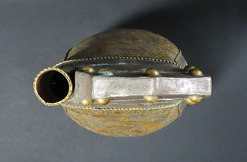 日本で作られた象嵌細工や 彫金細工 が施された逸品では無く、この 金工作品 は海外で作られた逸品で、外国のお土産のような作品です。 どっしりとした作りで、落ち着いた作品のように見えますが、錫のような柔らかい金属で作られており、少しの衝撃でも変形いたします。 もちろん共箱も無く作者の銘も入っておりません。 共箱 や合わせ箱はありませんが、ご覧のように 保存状態 の良い 逸品 です。 この作品は、競り市やオークションで買い受けた作品ではありません。 直接お客様より入荷した品物です。