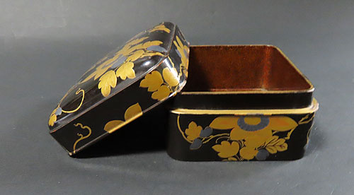 平蒔絵で丁寧に桐の紋模様の 蒔絵 が施された綺麗な蒔絵箱です。 内側には梨地の蒔絵があり丁寧に 漆塗 りが施され、昔の 職人技 が素晴らしい 逸品 です。 明治時代末頃から昭和初期にかけて作られた漆芸品で、少し擦れ傷がありますが、大きく傷んでいる所は無く、保存状態 の良い丁寧な作りの作品です。共箱 や合わせ箱はありません。 このような小さな小物入れの様な蒔絵箱は、煎茶道具 や抹茶道具の 茶道具 にも 香合 や飾り道具として使われ、遊び心のある面白い作品が多くみられます。