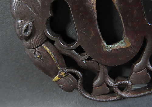 透かし彫りが丁寧に施され、金象嵌細工が素晴らしく、龍の眼球まで金象嵌が施されて