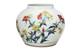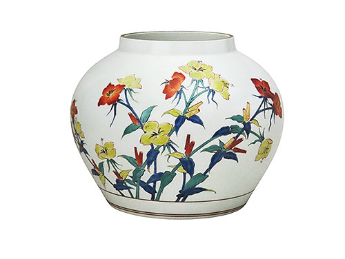 昭和時代の伊万里焼で、十三代酒井田柿右衛門の濁手月見草文花瓶作品で買取しました。すべて手描きで、面白い骨董品の手作りの作品です。綺麗な模様で 上り の良い品物で買取ました。綺麗な 色絵 で、図柄 が華やかで可愛い 置物 の 花瓶 です。描き込みが 細密 で、色絵が非常に美しい酒井田柿右衛門ならではの 骨董品 の置物の花瓶です。このような 色絵 が美しい 逸品 は、日本の骨董品のなかでも外国のお客様に人気で、伊万里焼 の中でも酒井田柿右衛門の 陶芸 作品は人気があります。 伊万里焼は16世紀末の朝鮮出兵時があり、朝鮮人陶工の李参平を連れて帰り、彼が磁器原料の磁石を発見し、が出来るようになりました。朝鮮人陶工の李参平に教えてもらい、日本人陶工も磁器に関わる特殊な技術を習得して、そのうち色絵 技法 も習得しました。このようにして日本の国内の磁器市場を築き酒井田柿右衛門の作品も伊万里焼の代表です。