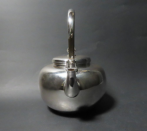 この 金工作品 は煎茶道具の銀瓶で、材質は純銀製です。 丸みを帯びた曲線美は、日本独特の 職人技 が生かされております。 明治時代から昭和初期にかけて日本で作られた銀瓶で、蓋の摘みが七宝透かしの模様が丁寧に作られた 逸品 です。 採光の加減で白く光っておりますが、ご覧のように凹み等無く非常に 保存状態 の良い品物で、合わせ箱が付いております。