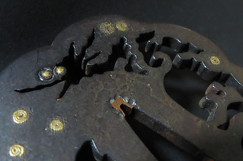 昔の 職人技 が窺える逸品で、鉄地に龍の透かし彫りが施され、面白い 図柄 の鍔です。