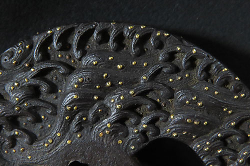 両面ともに、地肌の鉄に丁寧な波模様が、縁周りにまで施されており、散りばめられた小さな 象嵌細工 が躍動感のある波頭を表現しており、伝承 された昔の 職人技 の象嵌細工や 彫金細工 の技法が一体化された力強く迫力のある作品です。