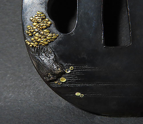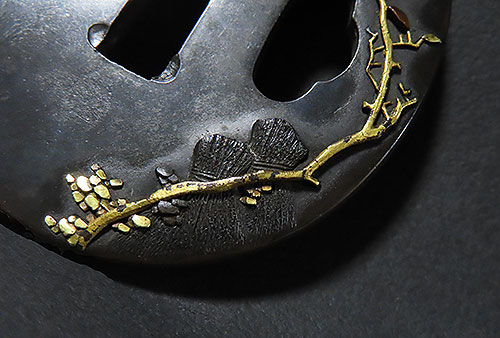 赤銅地の黒光りが、枝にとまる鳥の彫金細工を際立たせており、江戸時代当時の 金工師 の 職人技 が素晴らしい 逸品 です。