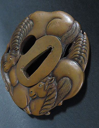 銅の地に躍動感のある馬の彫金細工が施され、伝承 された江戸時代の昔の 職人技 が冴える作品です。