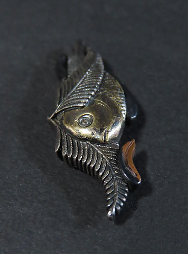 ご覧のように、シダのような植物に挟まれた鯛の 図柄 で、部分、部分に銀や 赤銅、またその他の合金の面白さが施された昔の 職人技 が冴える目貫です。
