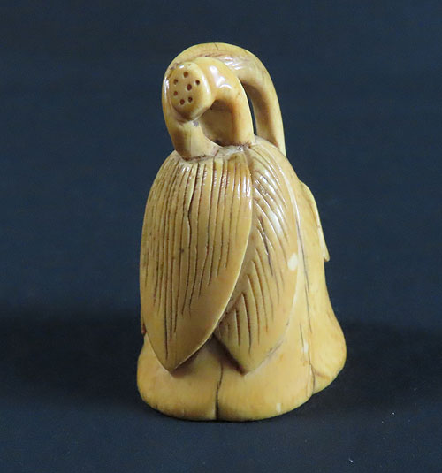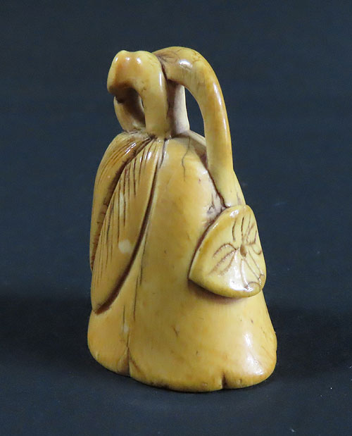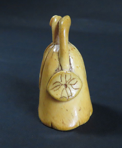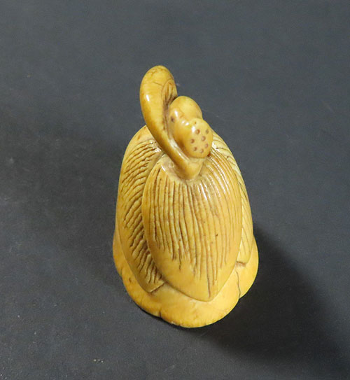 ユーモラスなモチーフが楽しい根付です。表情も面白く細部まで丁寧に彫られており、昔の 職人技 が素晴らしく、人物の表情が面白い珍品です。