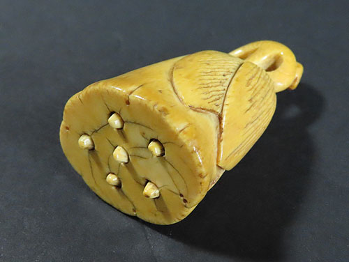 このような日本で作られた 骨董品 の根付、買取させて頂きます。面白いデザインで 細密 にしっかり編み込まれ