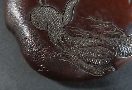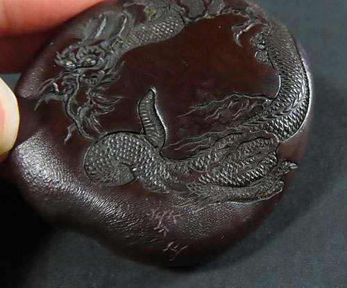 先代が コレクター の方より直接買い付けた 根付 で、銘 が入っておりますが、作者についてはよくわかりません。