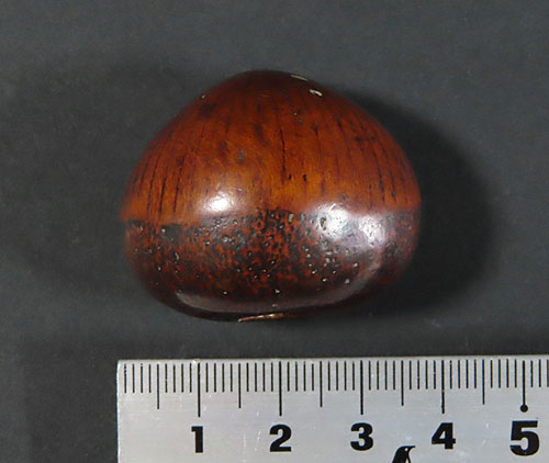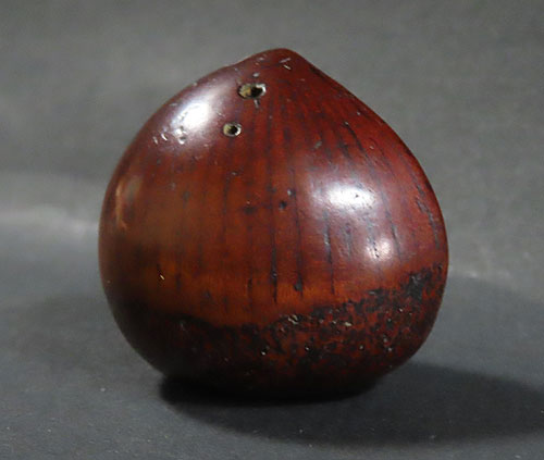 長年の時代を経てきた重みのある風格が見られる名品です。木彫りの根付で、木味の温もりが伝わる逸品です。
