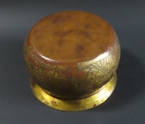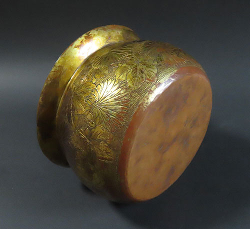 蓋裏に菊蒔絵が描かれ朱で宗明宗匠の在判が入っております。