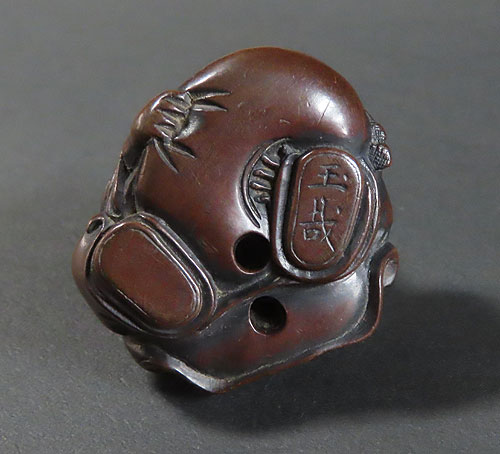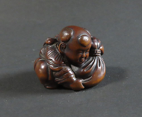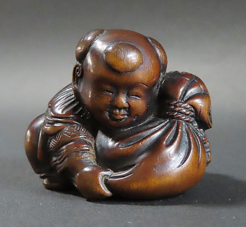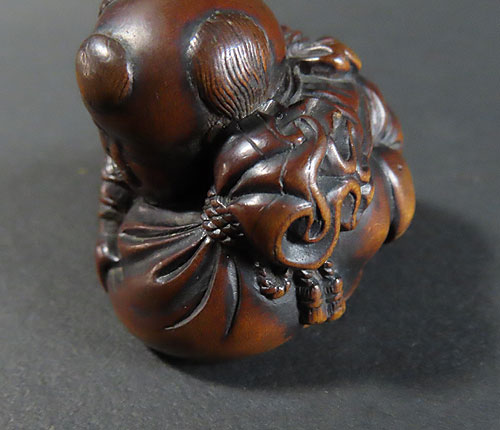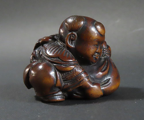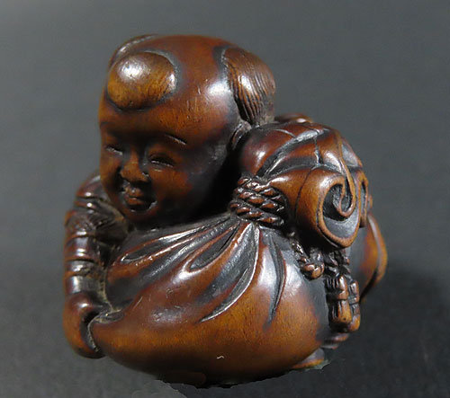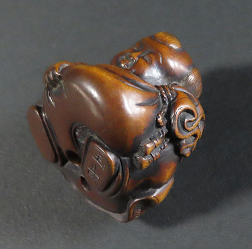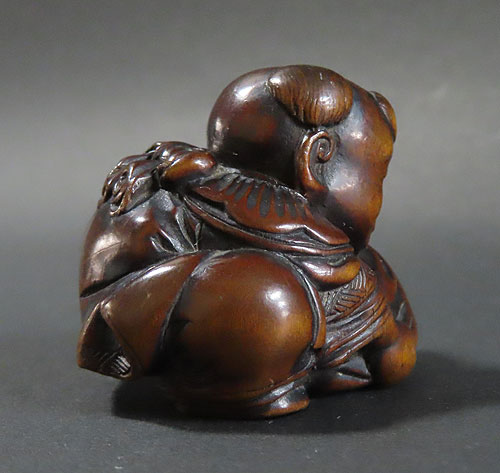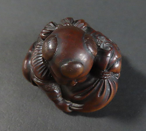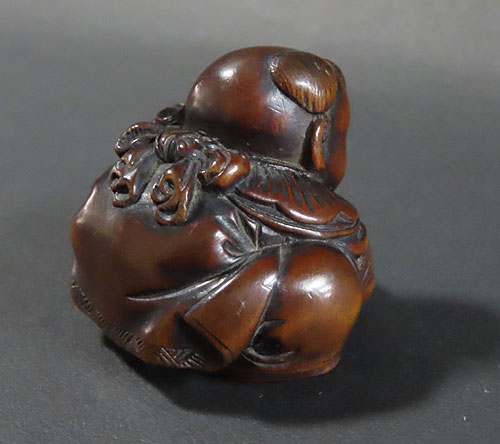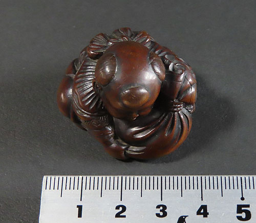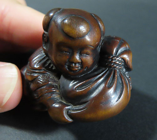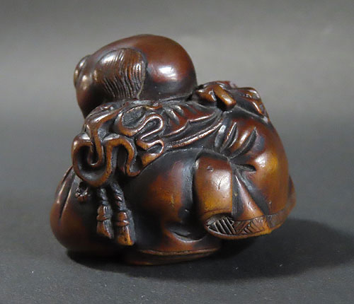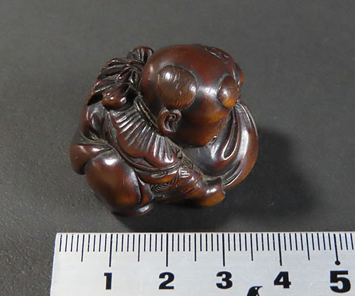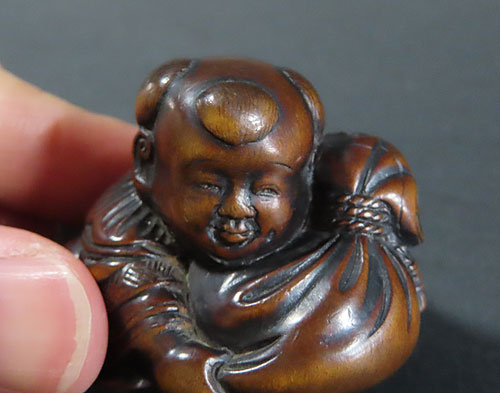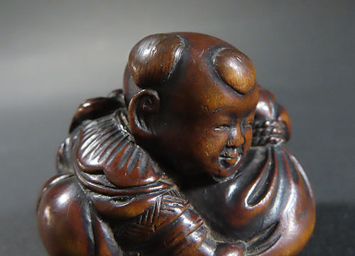 ユーモラスなモチーフが楽しい根付です。表情も面白く細部まで丁寧に彫られており、昔の 職人技 が素晴らしく、人物の表情が面白い珍品です。