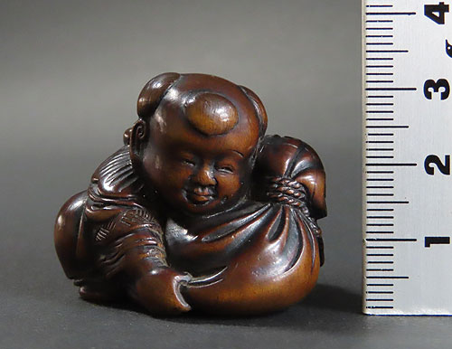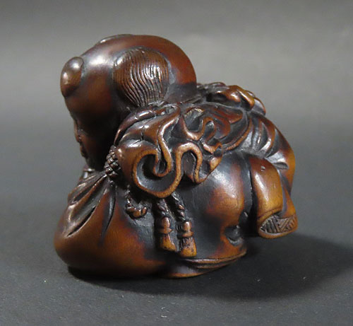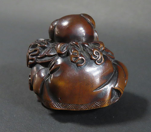 長年の時代を経てきた重みのある風格が見られる名品です。木彫りの根付で、木味の温もりが伝わる逸品です。