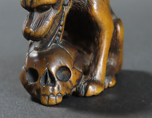 顔の表情や犬の愛らしい姿が表情豊かに表現されており、昔の職人の彫る技法が際立つ作品です。