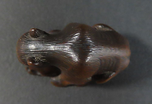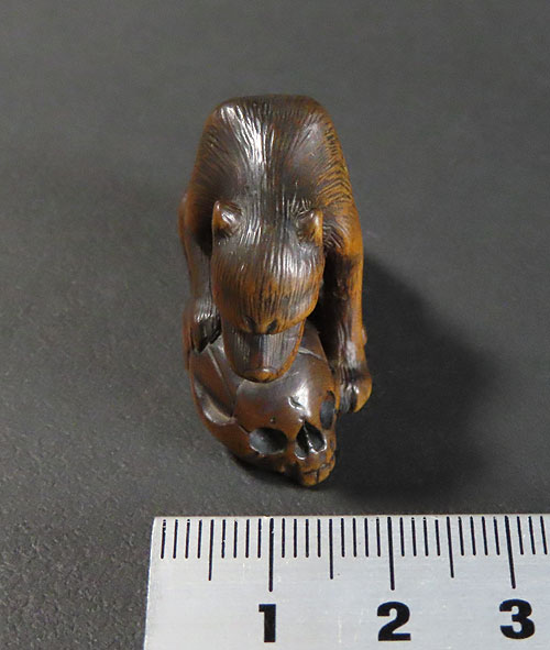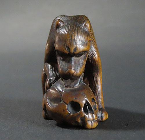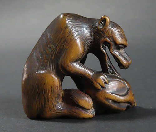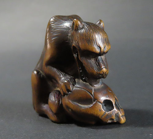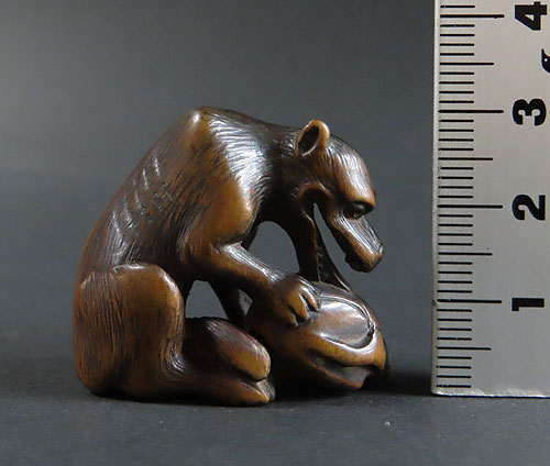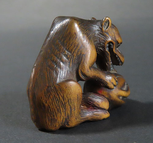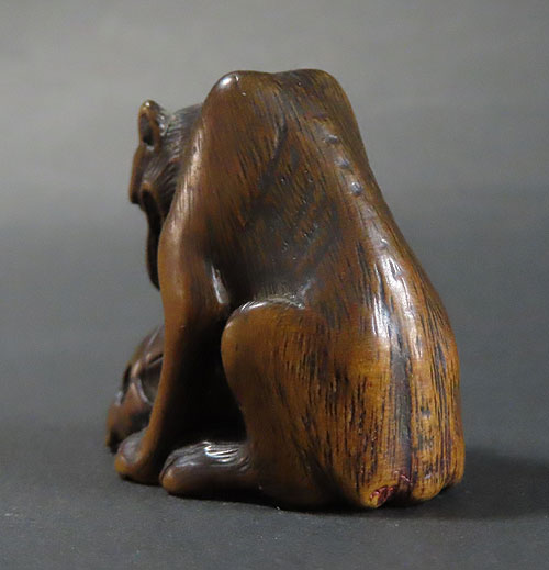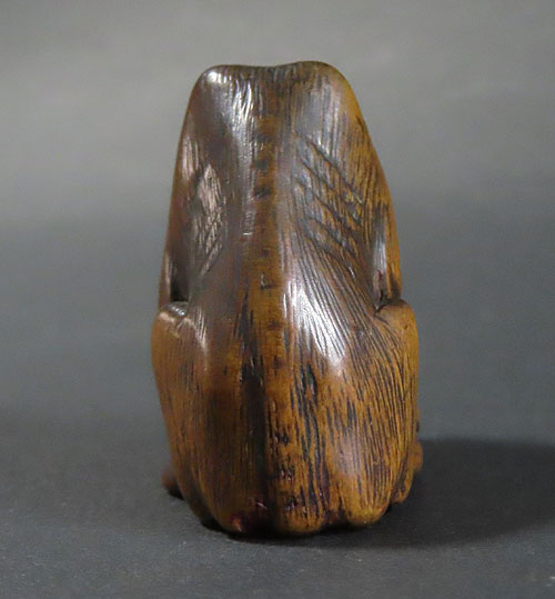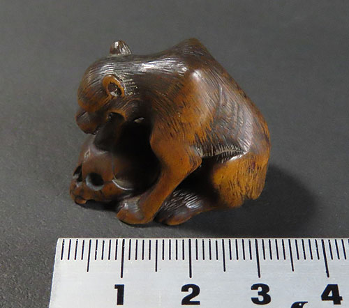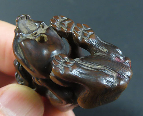 長年の時代を経てきた重みのある風格が見られる名品です。木彫りの根付で、木味の温もりが伝わる逸品です。
