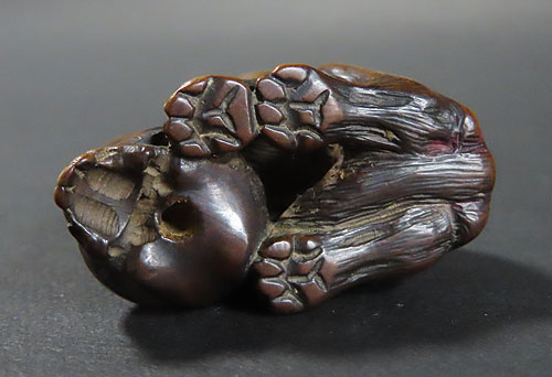 この根付は江戸時代で木製の型彫り根付です。