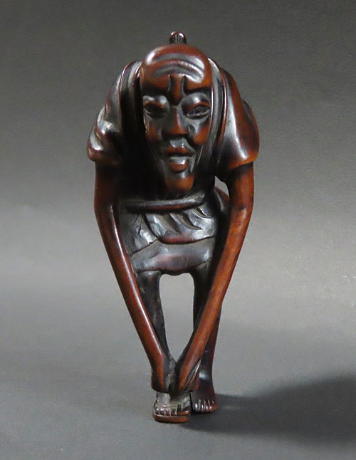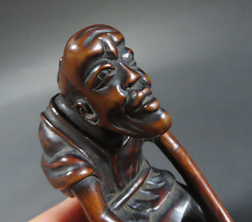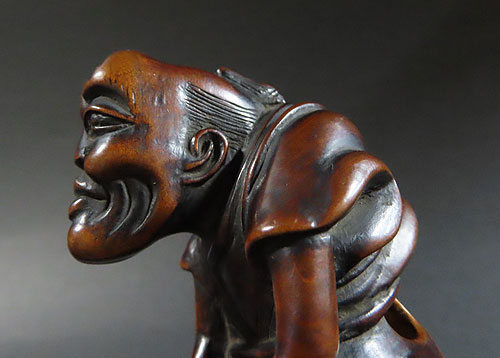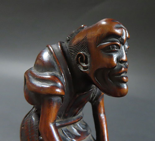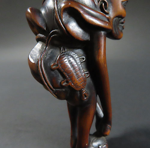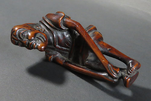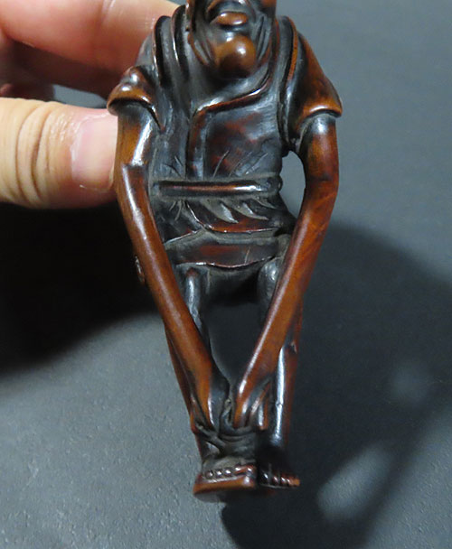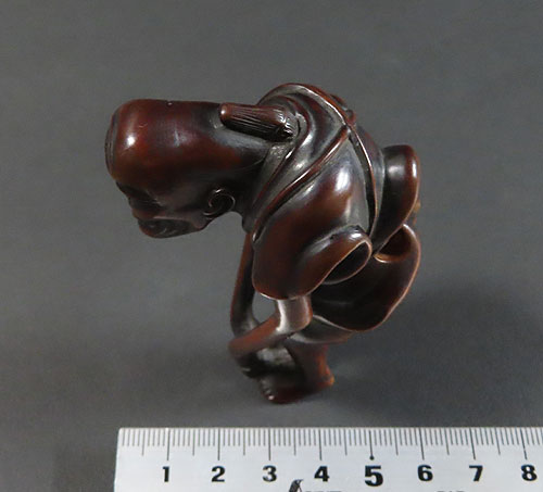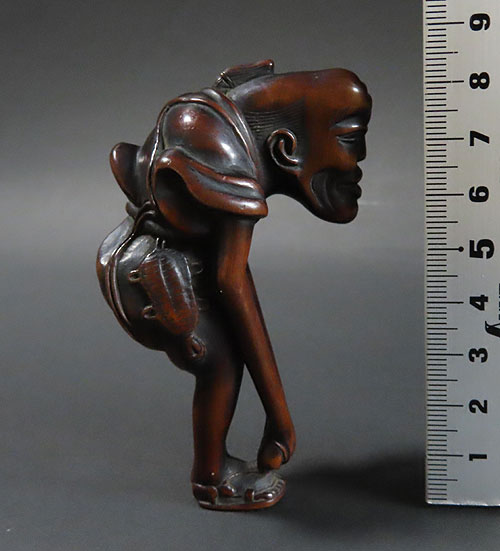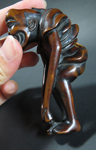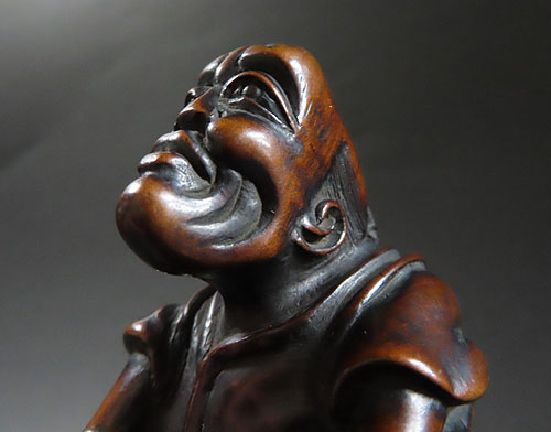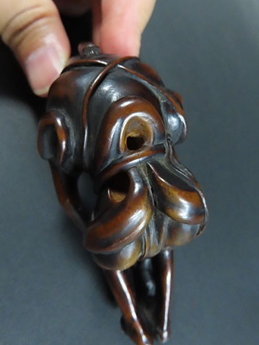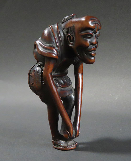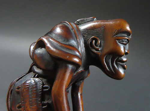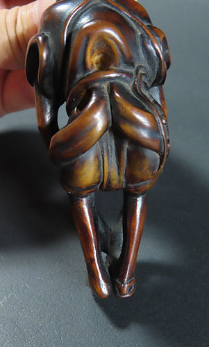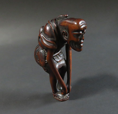 ユーモラスなモチーフが楽しい根付です。表情も面白く細部まで丁寧に彫られており、昔の 職人技 が素晴らしく、人物の表情が面白い珍品です。