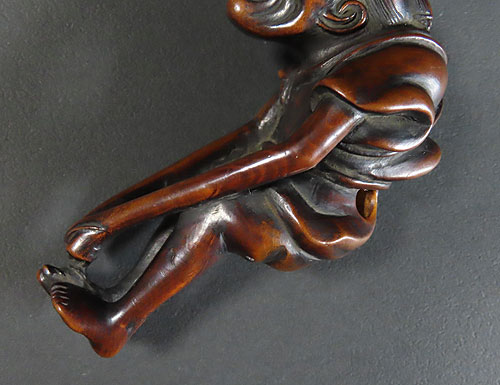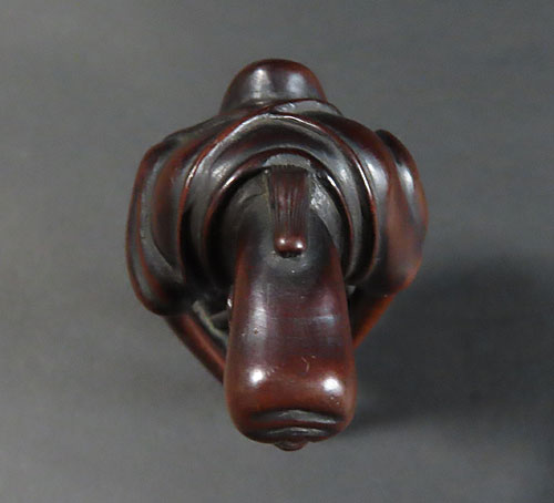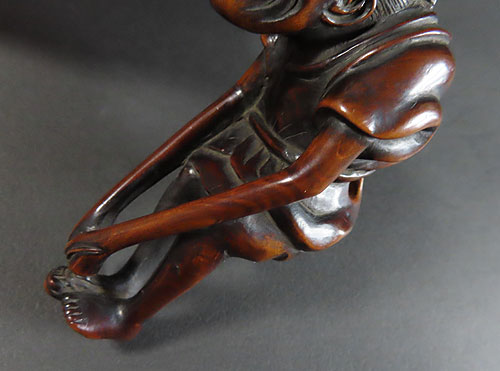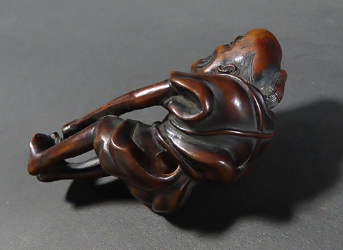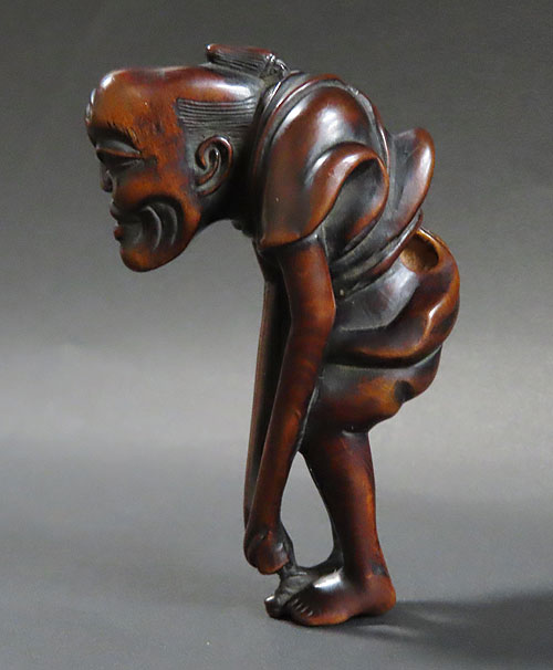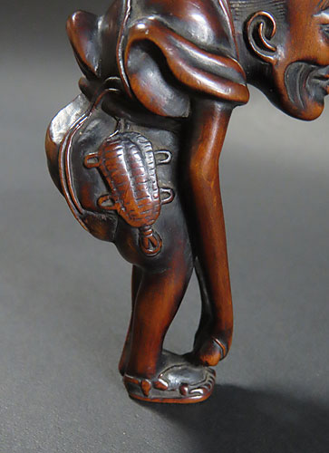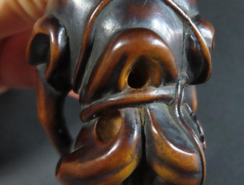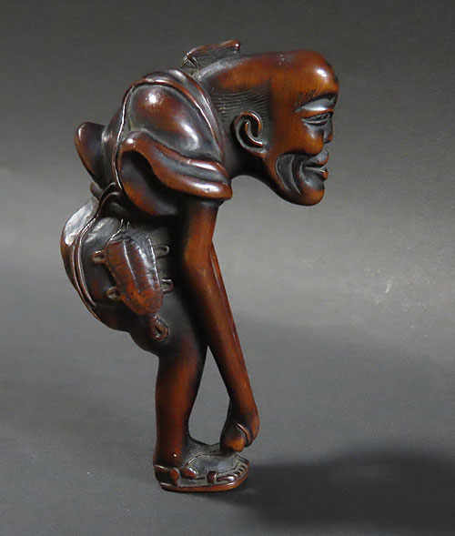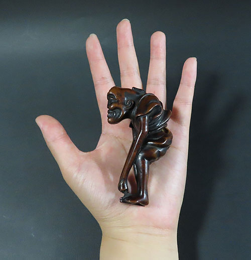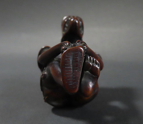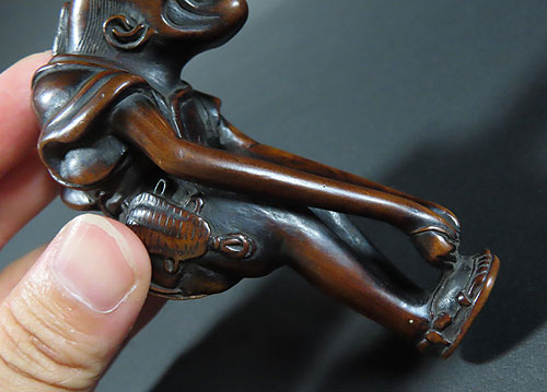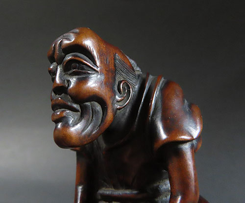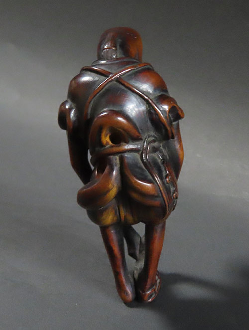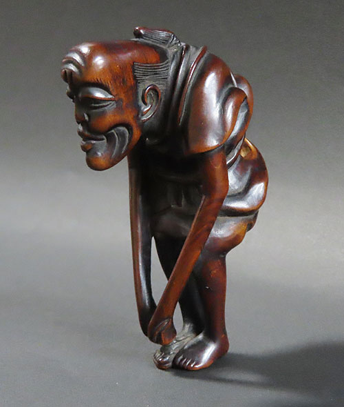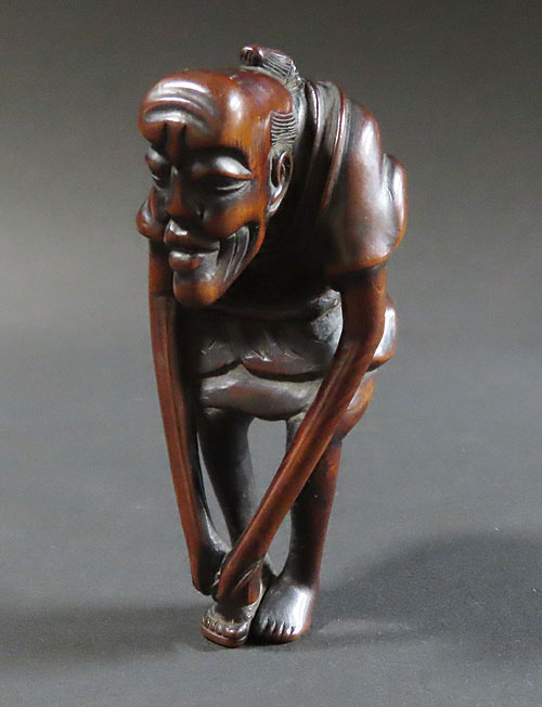 ユーモラスなモチーフが楽しい根付です。表情も面白く細部まで丁寧に彫られており、昔の 職人技 が素晴らしく、人物の表情が面白い珍品です。