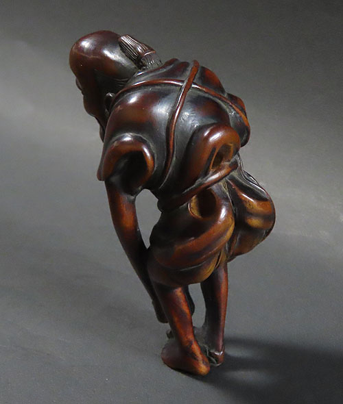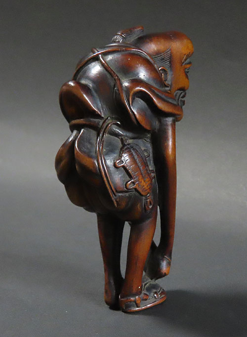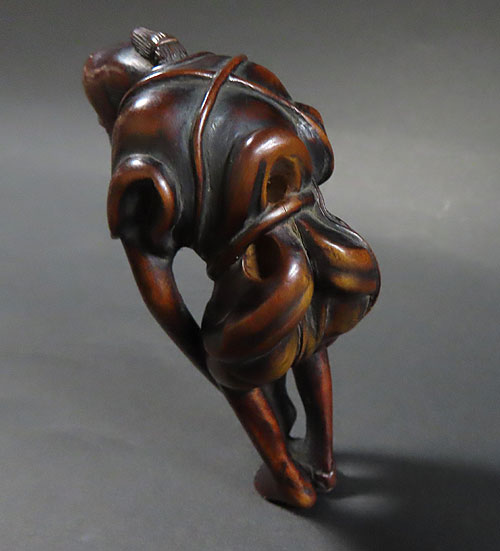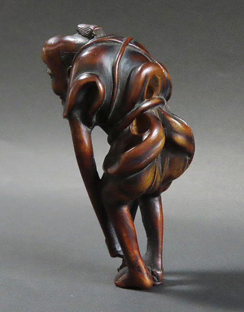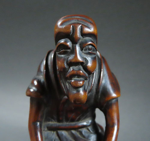 長年の時代を経てきた重みのある風格が見られる名品です。木彫りの根付で、木味の温もりが伝わる逸品です。