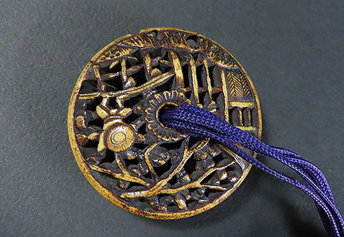非常に丁寧に菊の彫金細工が施された 金工細工 の鏡蓋が付いております。