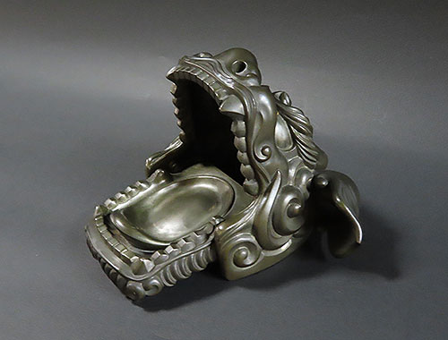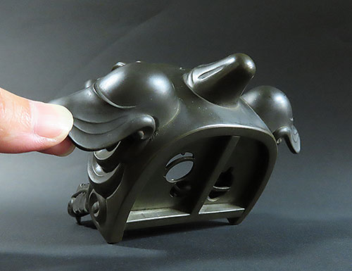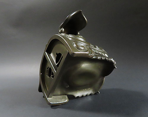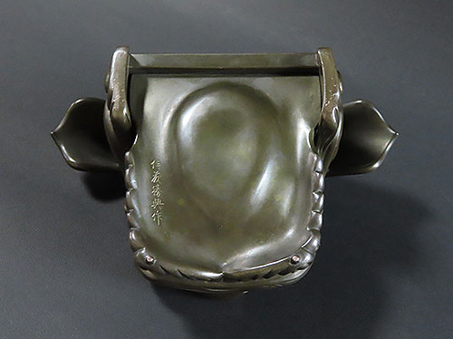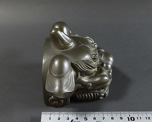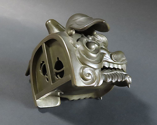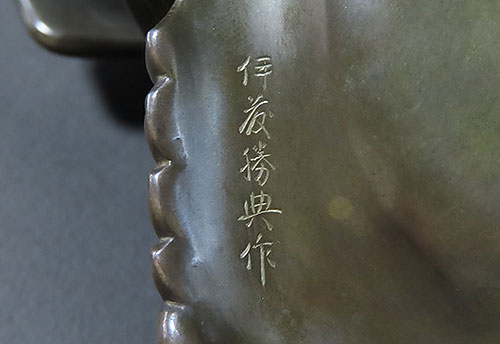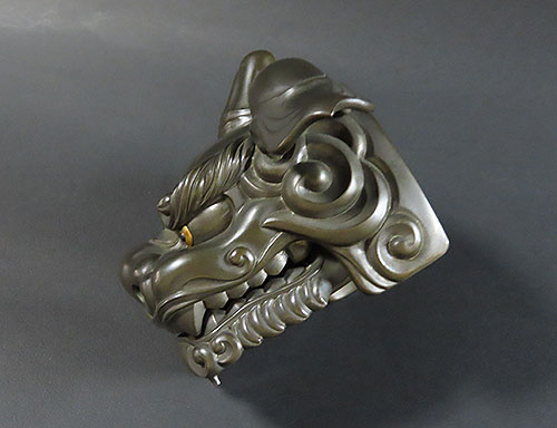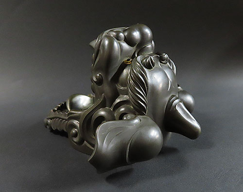 赤銅は銅と金の合金で出来ており、黒く輝く色彩が作品を際立たせております。