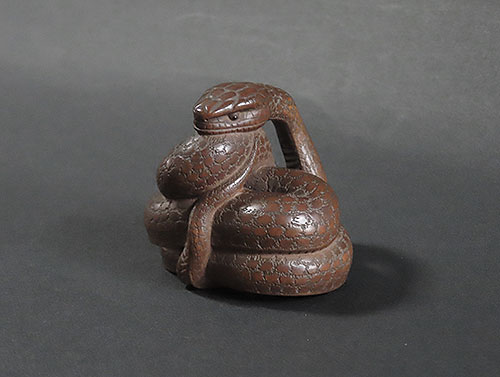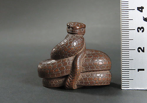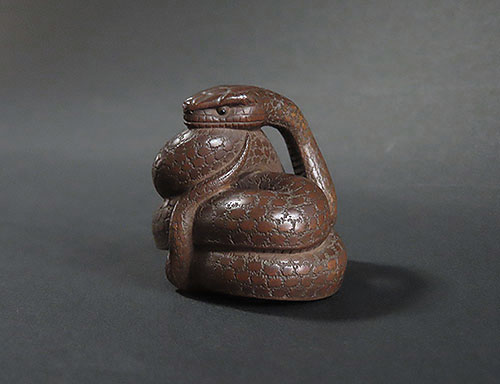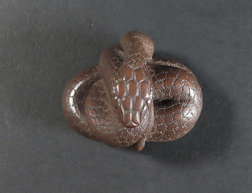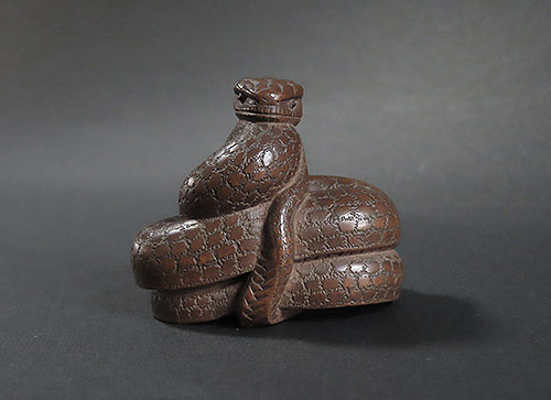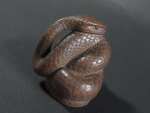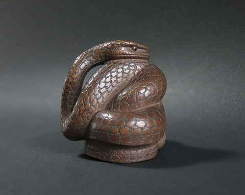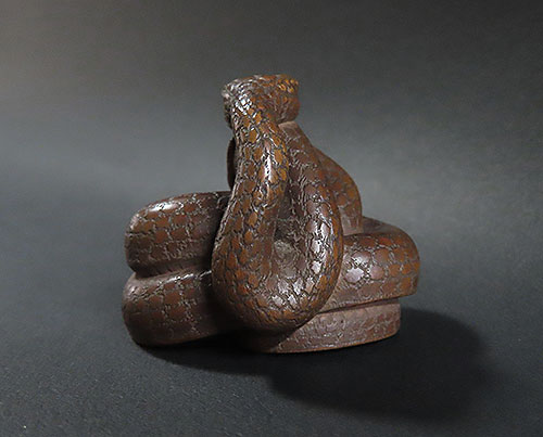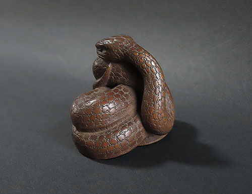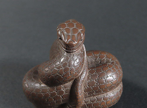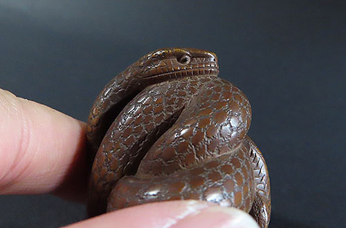 今にも襲ってきそうな躍動感のあるリアルな蛇の表情が見事な出来栄えの良い根付です。