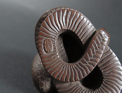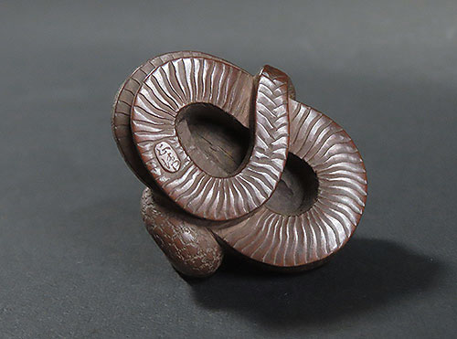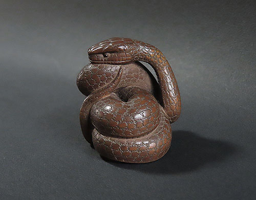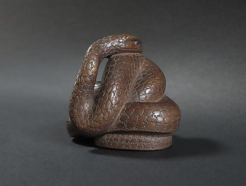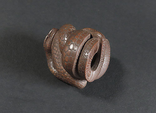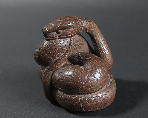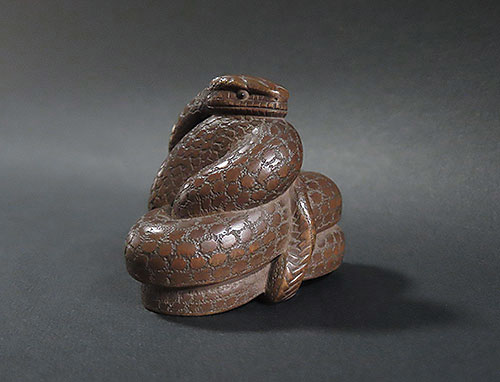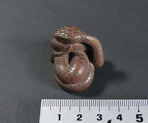 伝承 された彫る技法が素晴らしい逸品で、ご覧のように蛇の鱗も生き生きとした丁寧な 彫刻 が施されており、迫力のある根付です。