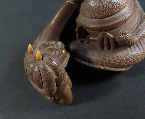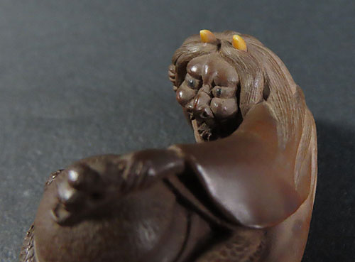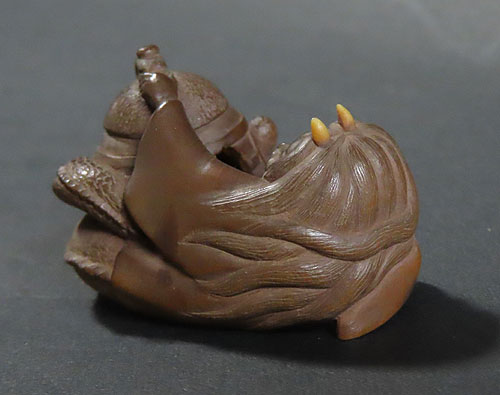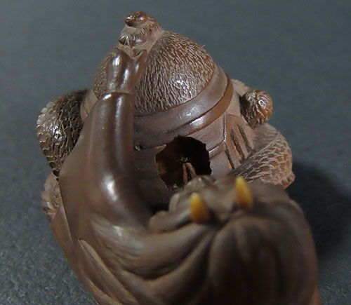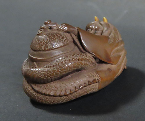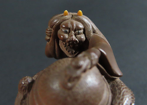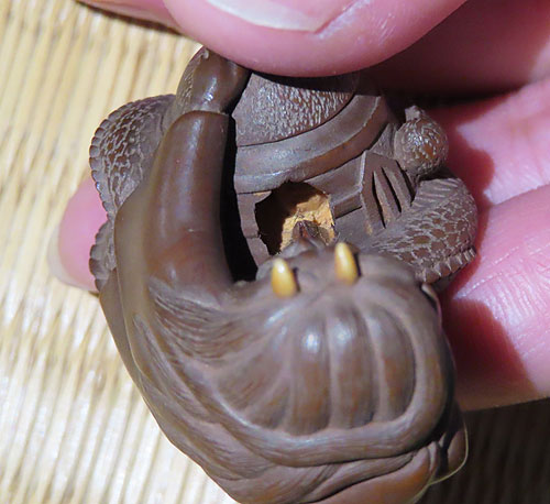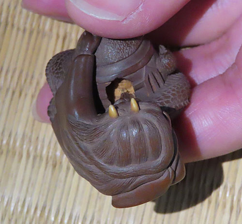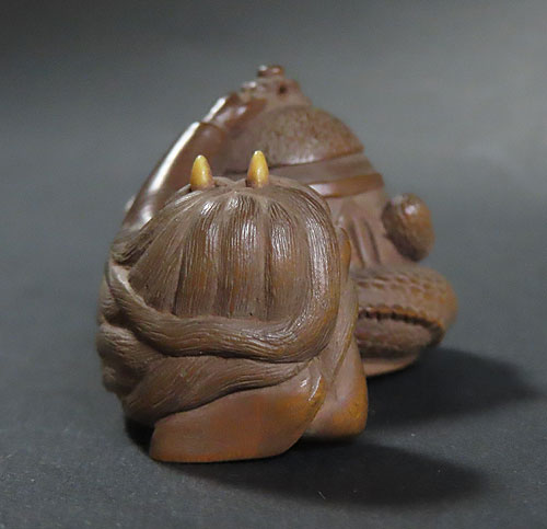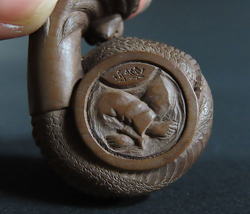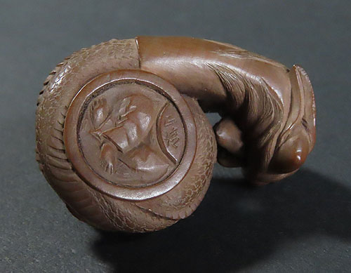 この根付は木製で、伊勢根付三代正直の阪井正清(1875~1955)の根付です。