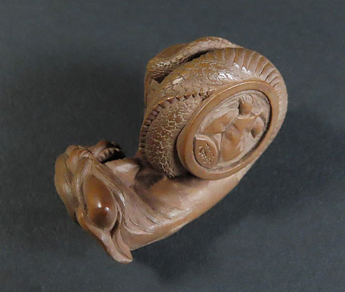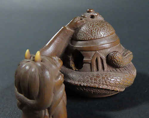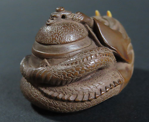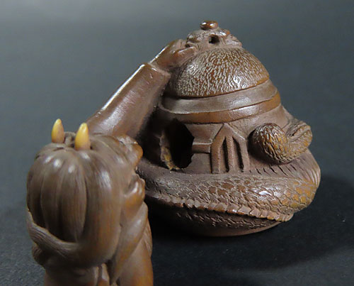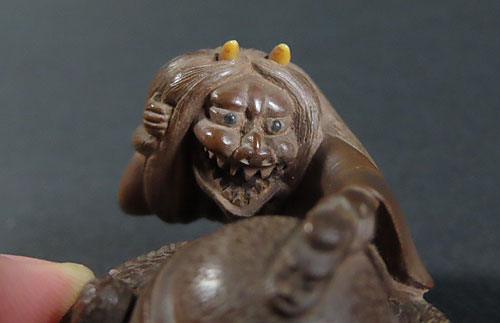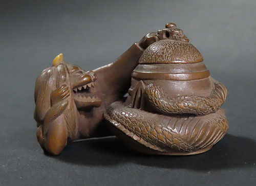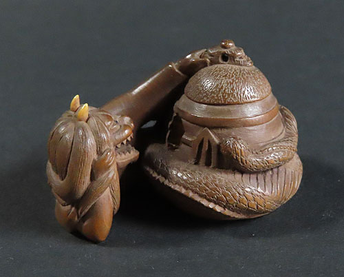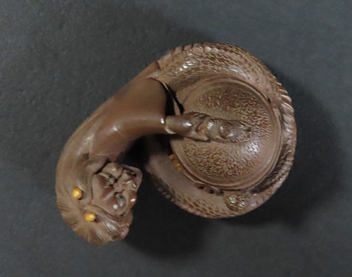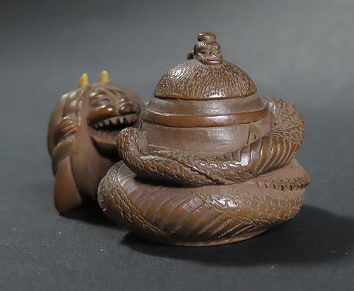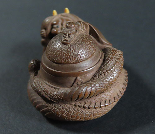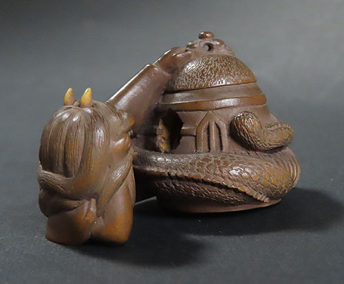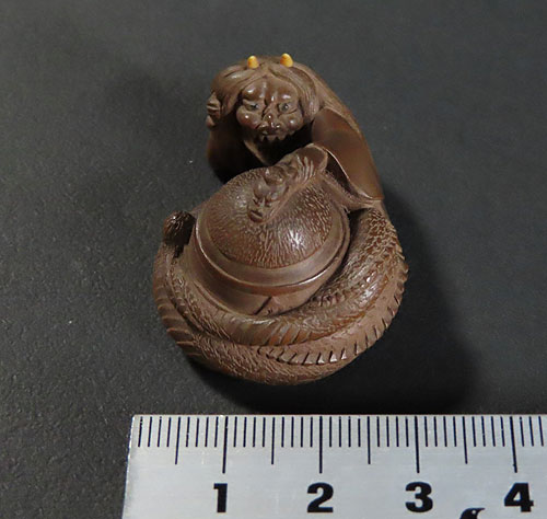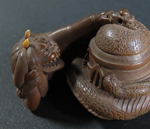 能の演目「道成寺」を用いた作品で、リアルな蛇女が釣鐘の中に隠れた男を見つける女の執念を描いた根付です。