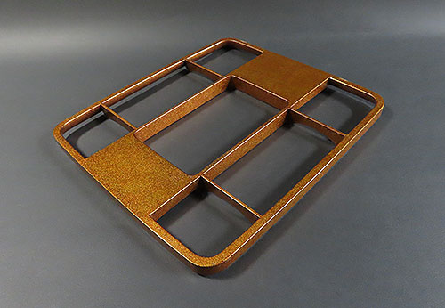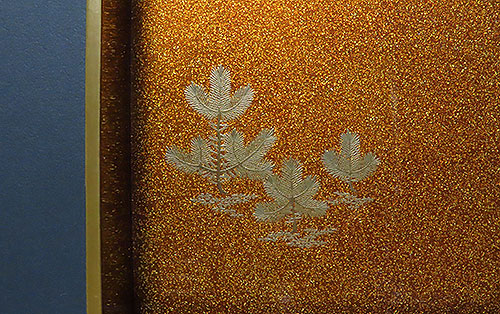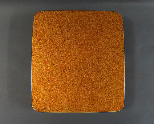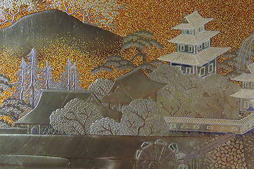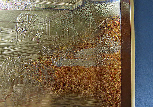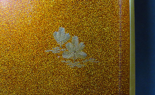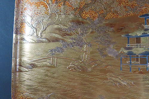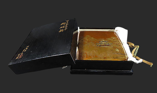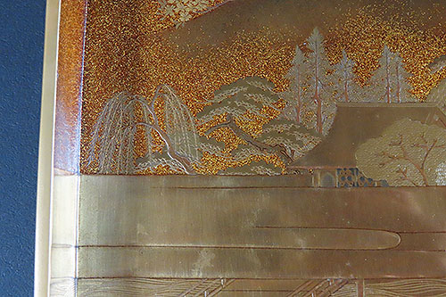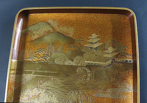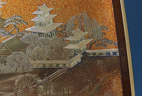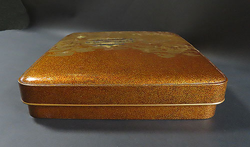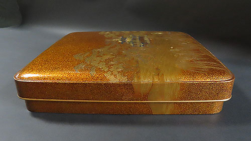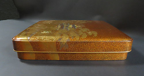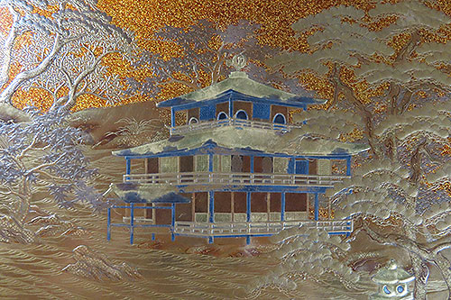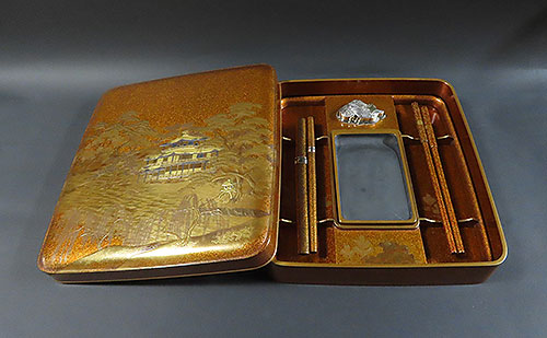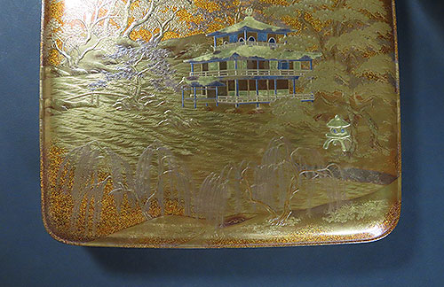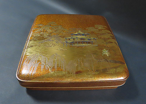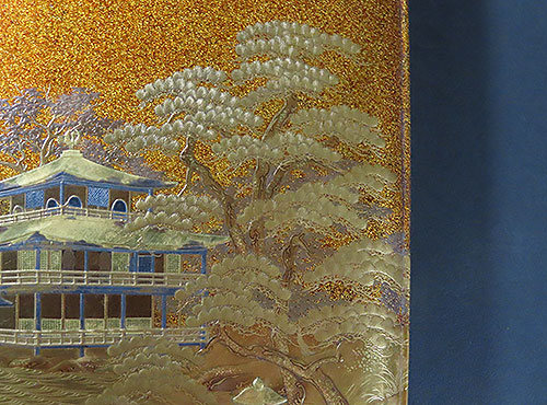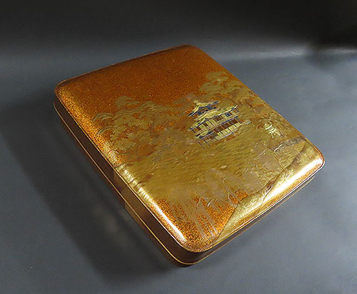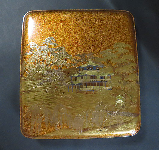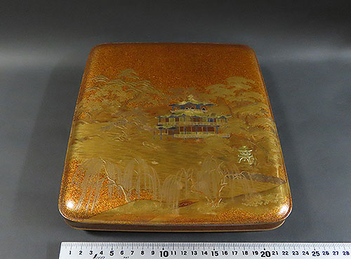表面は金閣寺の 図柄 で、梨地 に建物の金閣寺や水面、柳や松林、紅葉等が素晴らしい高盛蒔絵で施されており、伝承された巧みな 職人技 の 技法 が冴える作品で、さすがと思わせる老舗象彦の 名品 です。