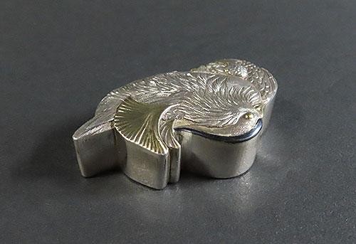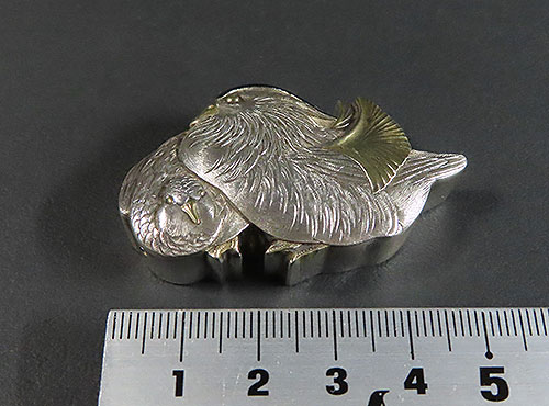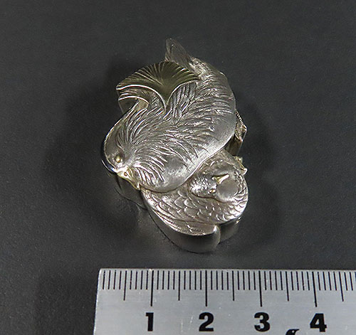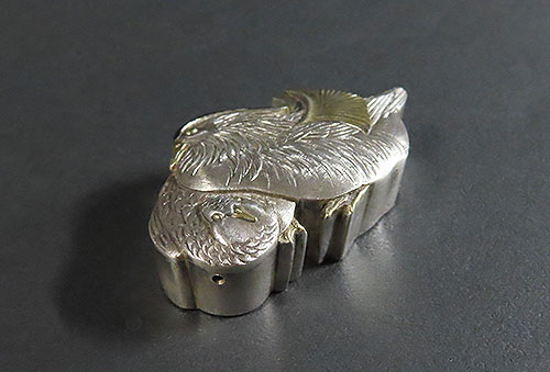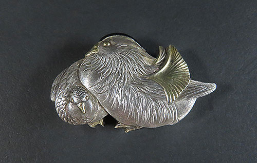 水滴は純銀で出来ており、緻密 な技法で丁寧に彫金細工が施され、鴛鴦が味わい深く表現されております。