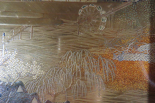 蓋裏も同じように素晴らしく、京都の名所の蒔絵が高盛蒔絵や螺鈿細工で施されており、丁寧で華やかな技法が際立ち、昔の職人技が冴える優雅な硯箱です。