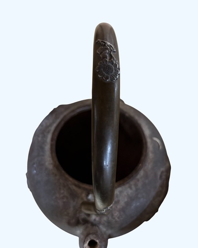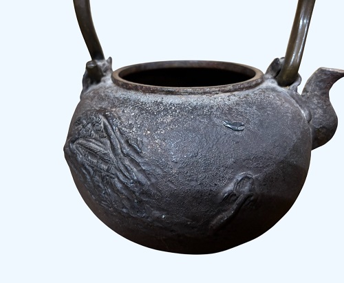 当時の 職人技 を創意工夫して表現された 逸品 で、彫金細工が面白く、現在では見られない珍しい鉄瓶です。