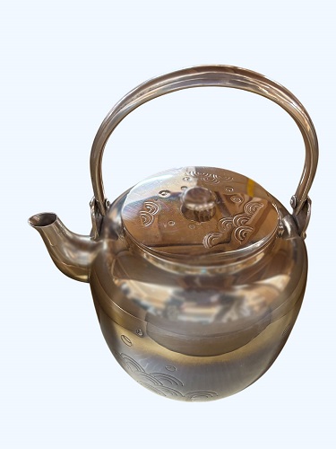 地模様の優雅さが存在感を高めています。純銀製品です。煎茶道具の銀瓶で、共箱 です。