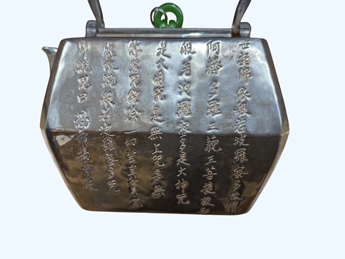 煎茶道具の銀瓶で、地模様のお経が存在感を高めています。