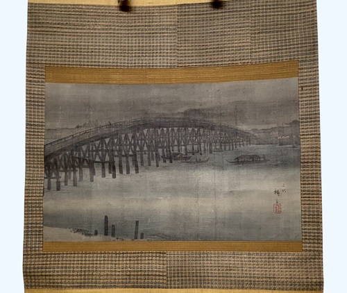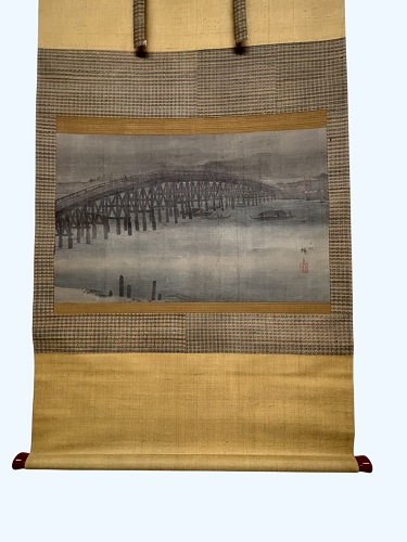 江戸時代のままの表具で、当時の貴重な 裂 が使われており、南画に似合う落ち着いた表具が施された掛軸です。