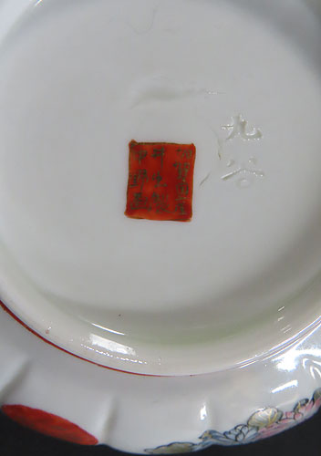 この作品のように九谷焼は丁寧に作られた作品には、内側に濃い色合いで、字や絵が綺