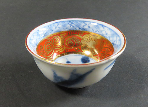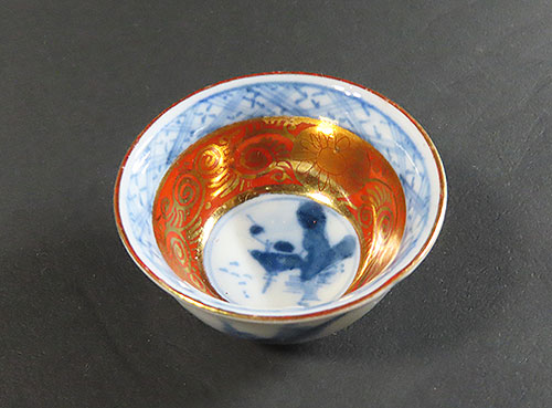 この 赤絵 の猪口の九谷焼は明治時代から昭和初期の作品です。