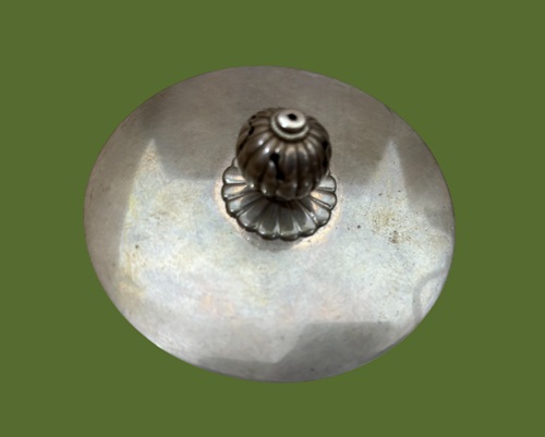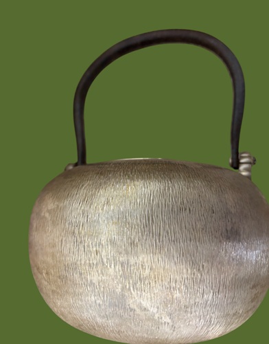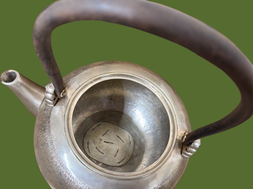 材質は純銀製です。 ご覧のように凹み等無く非常に 保存状態 の良い品物です。 煎茶道具や抹茶道具に使われる銀瓶です。 地模様は綺麗な槌目が丁寧に施されており、昔の 職人技 が素晴らしい 銀瓶 です。 取っ手の部分は鉄で出来ており、鉄は加工がしにくく人気があり、また、美しく作られており貴重な銀瓶です。 形も良く昔の職人技が素晴らしい 逸品 です。 昔の品物で、銀の変色が見られますが、簡単に綺麗になりますが、昔のまま、販売しております。 採光の加減で白く光っておりますが、ご覧のように状態の良い品物です。